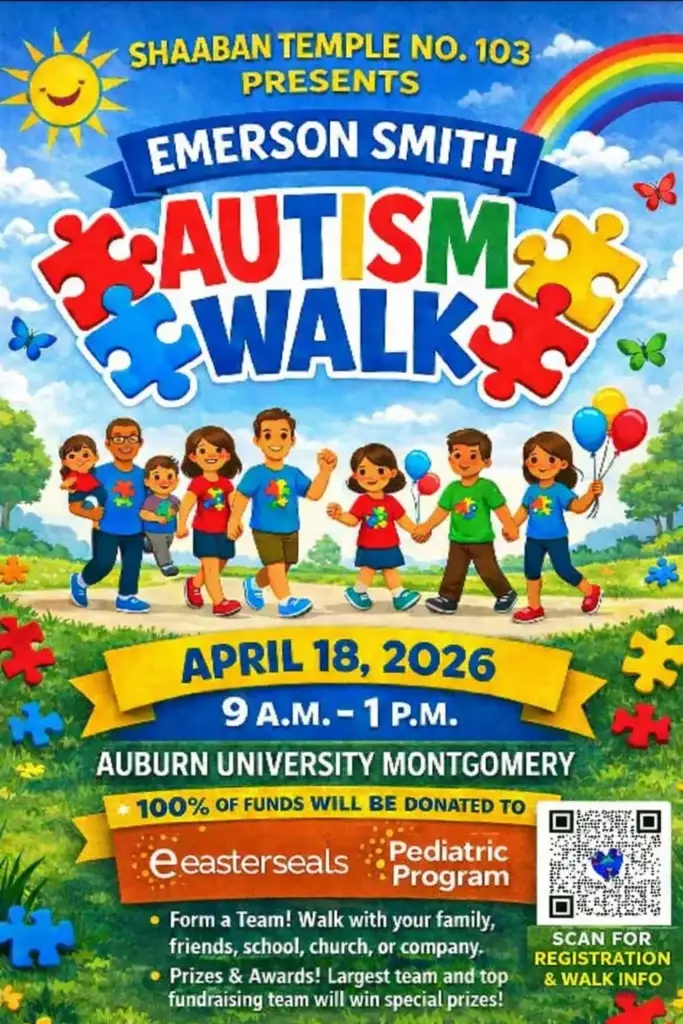 The Emerison Smith Autism Walk will be Saturday, April 18, 2026, from 9 a.m. – 1 p.m. at Auburn University Montgomery (AUM). All proceeds go to Easterseals Central Alabama’s Pediatric Program. Awards for largest team, top fundraising team and the best looking “TEAM” shirts.